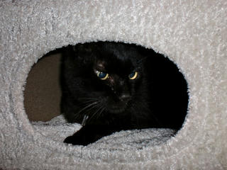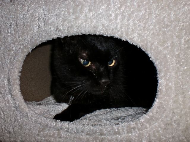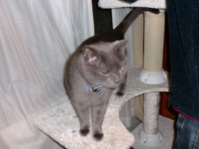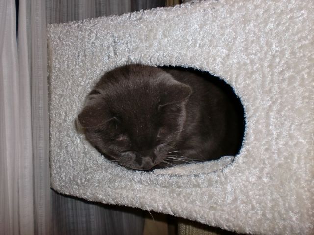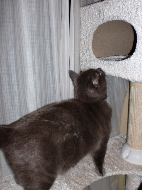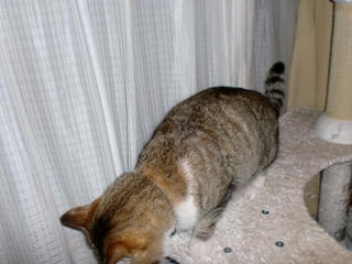 電気もついていない真っ暗の中で、ジジ君がキャットタワーに登って遊んでいました。